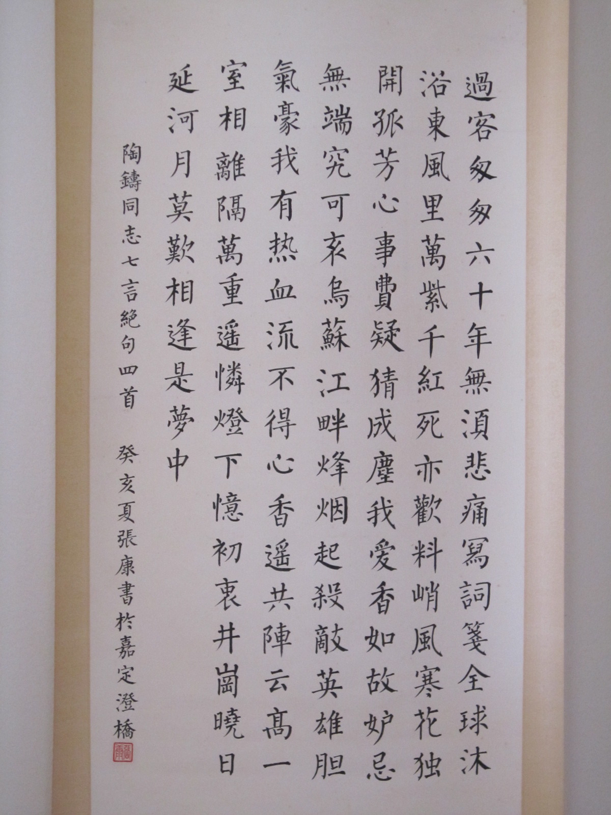 In his spare time, Kang likes to swim, play Pickleball, travel (see his travel page), and play Go, Guandan, and Bridge. Oil painting (won 3rd Prize in Shanghai in 1984. His recent works), paper art, logo design, porcelain painting, and Chinese calligraphy (won 1st Prize in Sichuan Province in 1981. The style Kang learnt is Liu Gongquan) (his own works in Regular Script, Clerical Script1, and Clerical Script2), and photography are his real hobbies.